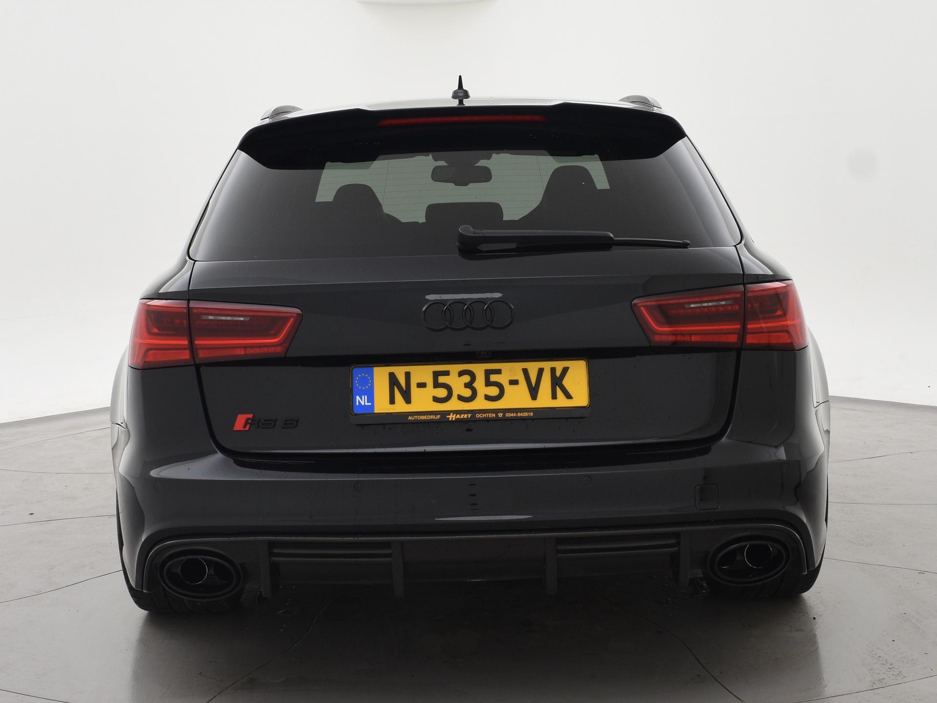 Audi RS6 4.0 TFSI V8 Bi-Turbo Performance met 605 PK vermogen en Quattro vierwielaandrijving, Audi Ceramic Brakes dus Keramische remmen, Audi Exlusive interieur met exclusive bi-color leder interieur + stoelen + middentunnel leder, Bang & Olufsen High End audio, Carbon interieur + exterieur styling, Carbon diffuser achterbumper, Carbon dashboard inleg, Carbon middentunnel, Privacy glass, 360 graden rondomzicht camera, Cruise control, 4-zone climate control, Zwarte alcantara hemelbekleding, LED koplampen, LED achterlichten, Elektrische achterklep, Keyless-entry en keyless-drive, Elektrische stoelverstelling met geheugen, Zwarte grille en logo's rondom, Achterspoiler, in 09-2025 bij 113.999 km nog onderhoud gehad.